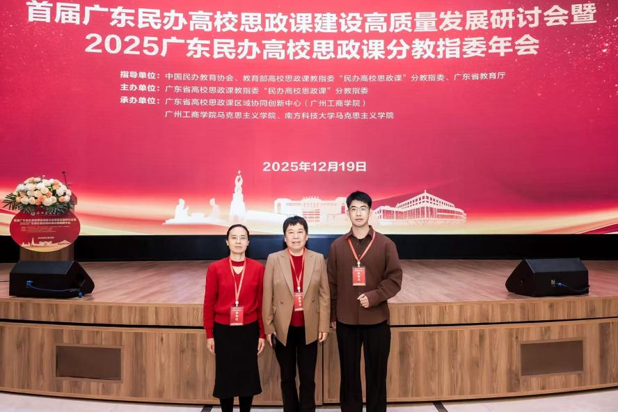 12月19日,首届广东民办高校思政课建设高质量发展研讨会暨2025广东民办高校思政课分教指委年会在广州工商学院成功举办。本次会议汇聚了来自广东省教育厅、中国民办教育协会的领导专家,以及全省各民办高校马克思主义学院的领导、骨干教师代表共计130余人,共商智能时代民办高校思政课改革创新大计。广州理工学院马克思主义学院院长袁毓玲教授、副院长文妙虹副教授及青年教师代表王康老师一行三人应邀参会,并在交流环节分享了学院的建设经验与思考。