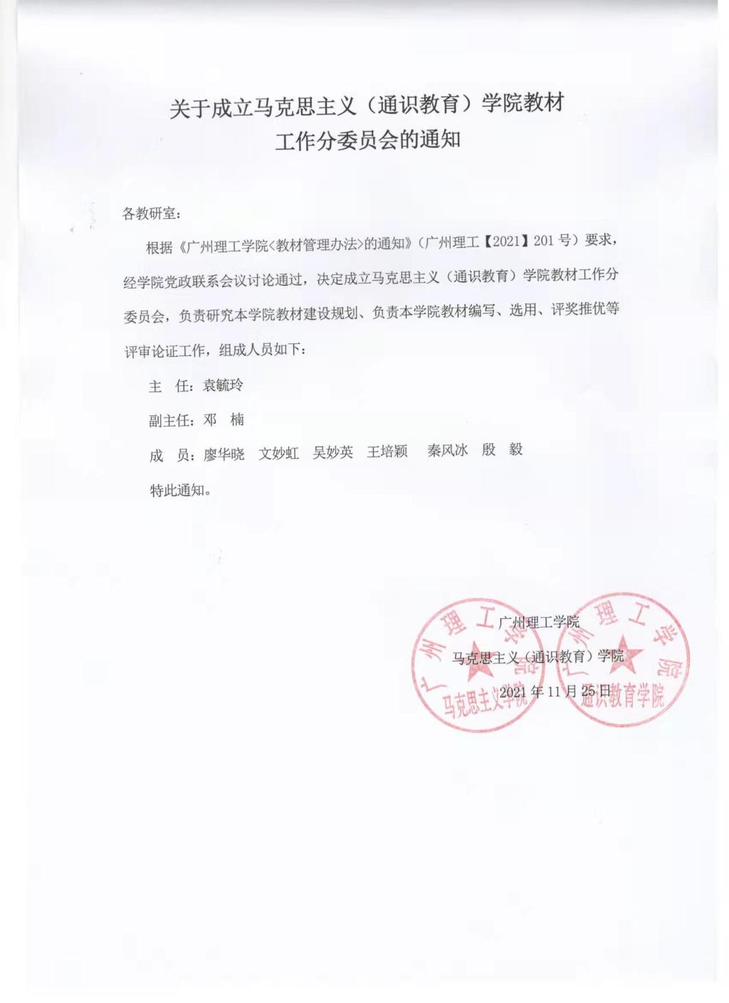 关于成立马克思主义(通识教育)学院教材工作分委员会的通知