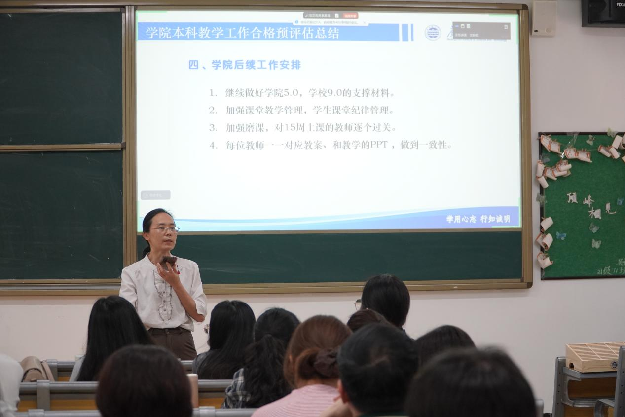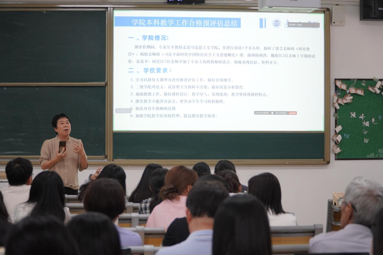 袁毓玲院长对本科教学合格预评估工作进行全面复盘。她指出,预评估期间,专家组完成访谈调研、课程抽听、试卷核查、教师座谈等多项工作,学院教师整体表现良好,各项迎评资料准备齐全、规范有序。袁毓玲院长传达了学校本科教学合格评估工作要求及3月23日教育部本科教学合格评估参评高校培训精神,要求全院进一步强化课堂管理,抓实抓细师德师风建设工作。同时,她对学院后续迎评工作作出系统部署,一是持续完善校、院两级本科教学合格评估支撑材料,确保材料完整规范;二是从严加强课堂教学管理与学生课堂纪律管控,持续提升课堂教学秩序;三是扎实推进磨课工作,对相关授课教师开展磨课逐个过关验收;四是严格落实教案与教学PPT内容一致性要求,夯实教学基本功;五是鼓励全院教职工积极参与思政课教师教学基本功比赛,以赛促教、以赛提质。袁毓玲院长强调,学校高度重视马克思主义学院建设,将其列为校内第一学院重点打造,全院教职工要切实提高思想认识,层层压实工作责任,以高标准、严要求推动各项迎评工作落地落实。