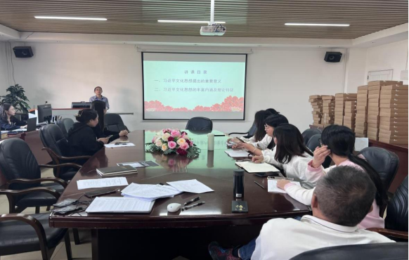 11月23日,马克思主义学院教工第二党支部在综合楼7-503开展“学习贯彻习近平文化思想”专题党课。党支部书记文妙虹同志主讲了《学习贯彻习近平文化思想》专题党课。