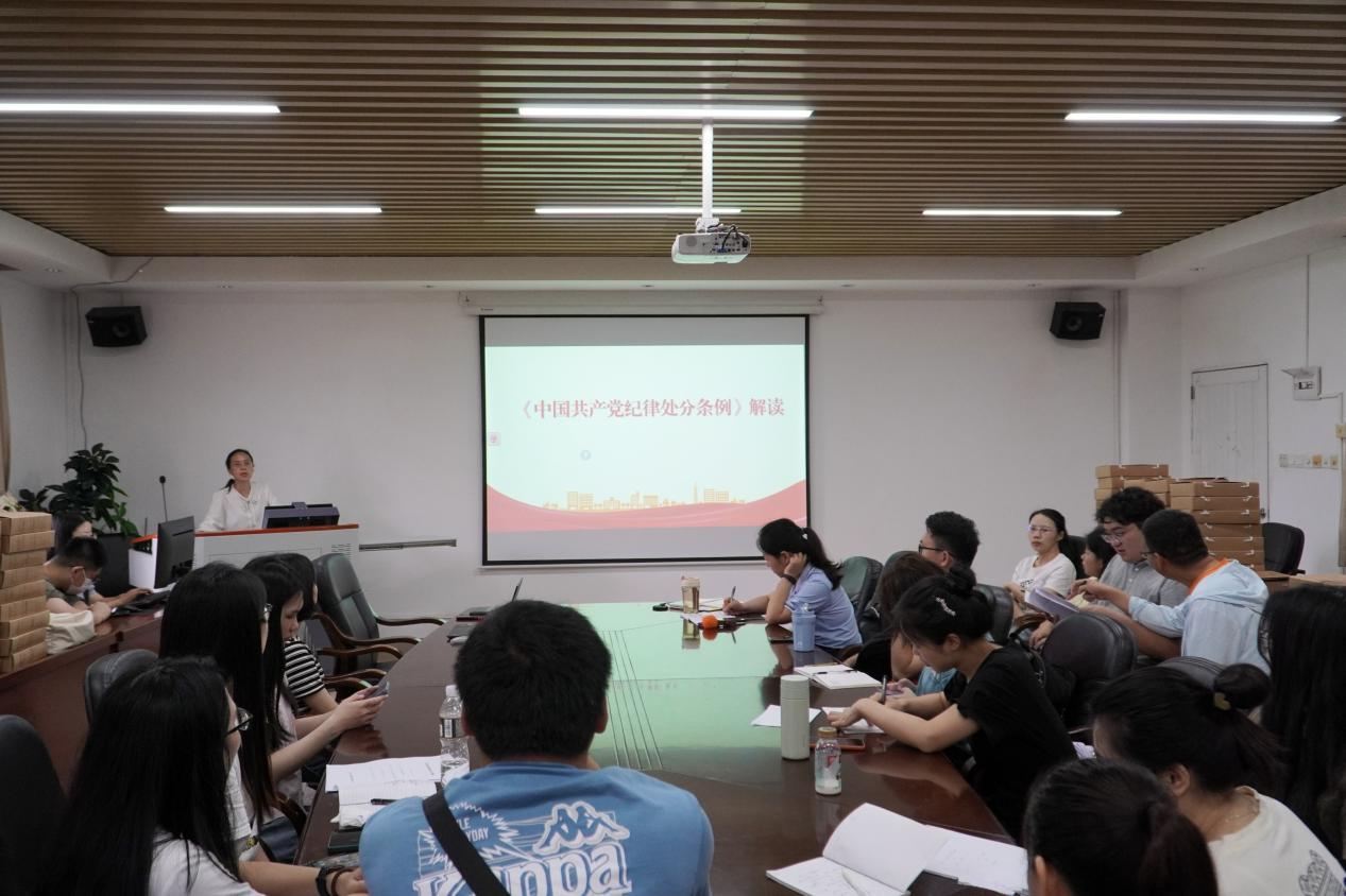 为深化党纪学习教育,增强广大党员纪律意识,6月13日上午,马克思主义学院教工第二党支部开展《中国共产党纪律处分条例》专题党课,由党总支副书记文妙虹同志主讲。