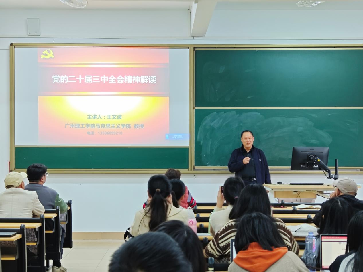 为深入学习贯彻党的二十届三中全会精神,全面学习领会习近平总书记关于全面深化改革的一系列新思想、新观点、新论断,12月12日,马克思主义学院党总支在综合楼502开展学习贯彻党的二十届三中全会精神专题辅导报告会,党史研究专家王文波教授围绕《党的二十届三中全会精神解读》作专题辅导,学院全体教职工参加。副院长文妙虹主持报告会。
