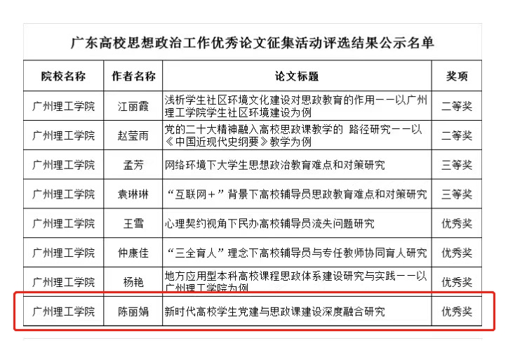 近日,由高校思想政治工作队伍培训研修中心(华南师范大学)和广东省高等学校思想政治教育研究会组织开展的广东高校学生工作案例和思想政治工作优秀论文征集活动结果揭晓,我院陈丽娟老师的论文《新时代高校学生党建与思政课建设深度融合研究》获广东高校思想政治工作优秀论文优秀奖。